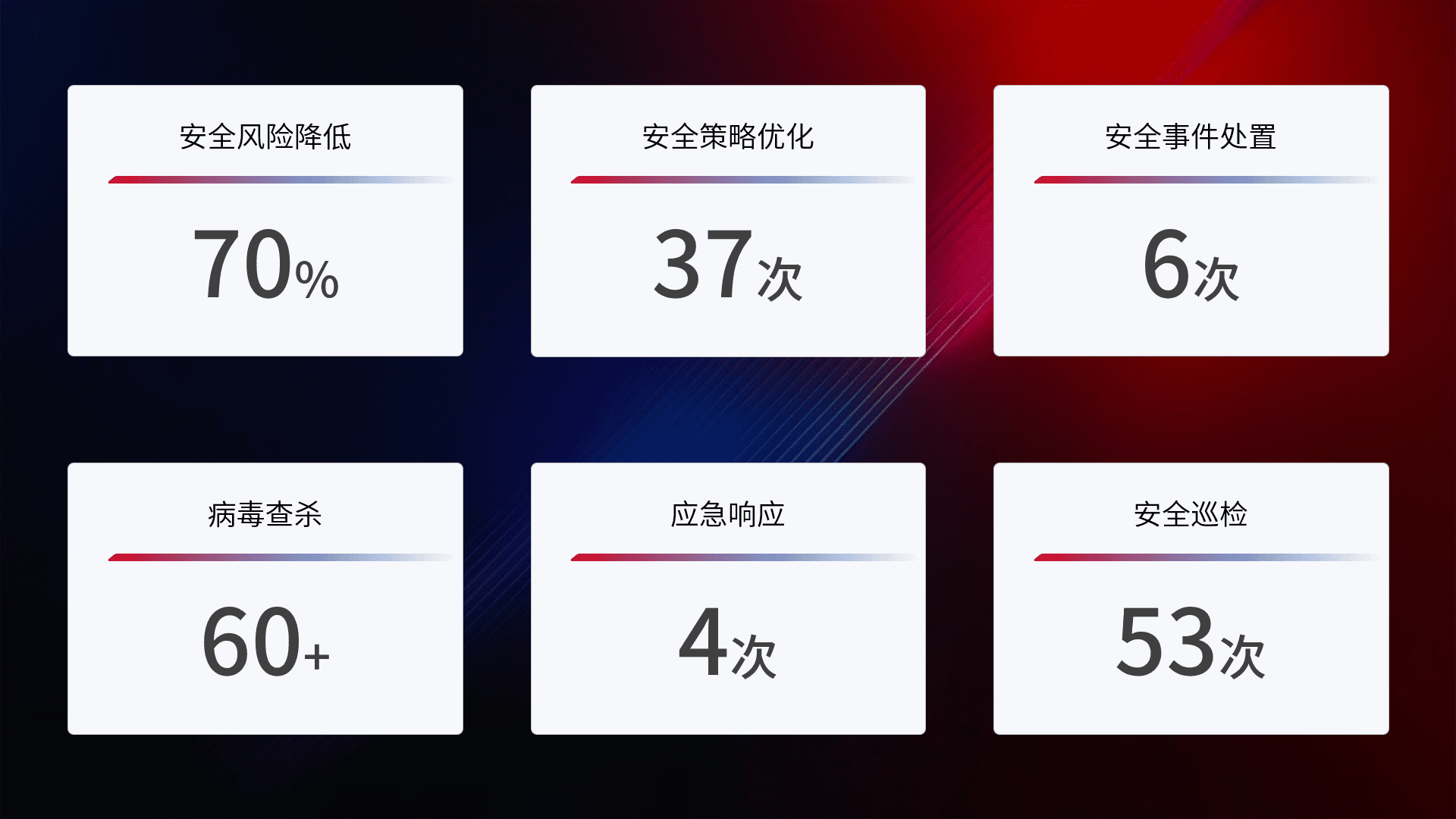 提供全面的安全事件报告体系,,,包括处置报告、、、周报、、季度和年度总结,,,结合持续监控,,,帮助客户深入了解网络安全状况。。