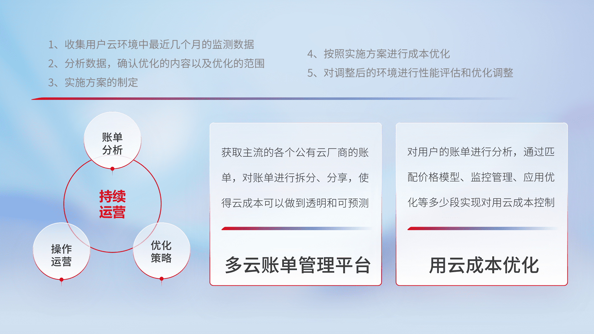 通过多云纳管,,以统一的资源数据模型把客户的云资源进行抽象和封装,,,进而实现对多云资源的统一操作,,,保障云资源管理的可靠性、、、稳定性与可用性。。量身定制化运维内容,,,,配置、、、、开发运维、、、补丁管理、、、、备份、、、、监控、、、认证和访问管理、、审计和日常巡检等,,,,保障在用云过程中的可靠度,,,稳定度以及高可用率。。。